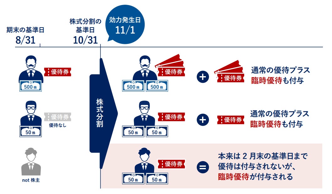 毎年2月末(当社第2四半期末)、8月末(当社期末)時点での株主名簿に記載又は記録された、1単元(100 株)以上の当社株式を保有されている株主様がそれぞれ対象となる株主優待制度については、株式分割後も現行制度の1単元以上での権利確定を維持します。あわせて今回、2025年10月末(分割基準日)時点の株主様を対象に、株式分割後の株式数に基づき1単元(100株)以上を保有されている方へ、臨時の株主優待を追加で進呈いたします。臨時優待の詳細につきましては、次ページをご参照ください。なお、2025年10月14日(火)18:00より開催予定の投資家向けオンライン会社説明会においても詳細をご案内申し上げます。