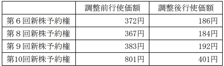 今回の株式分割に伴い、2025年11月1日の効力発生日と同時に新株予約権の1株当たり行使価額を以下のとおり調整いたします。