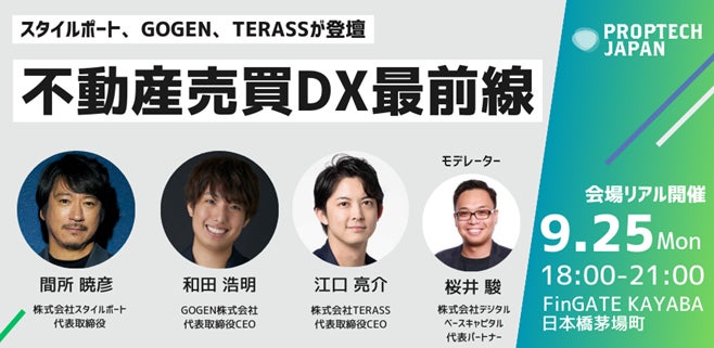 PropTech JAPANでは約3年ぶりとなるリアルイベントでのMeetup開催。不動産売買領域のデジタル化を牽引するスタイルポート、GOGEN、TERASSをゲストに迎え不動産DXの現在地と今後に迫ります。