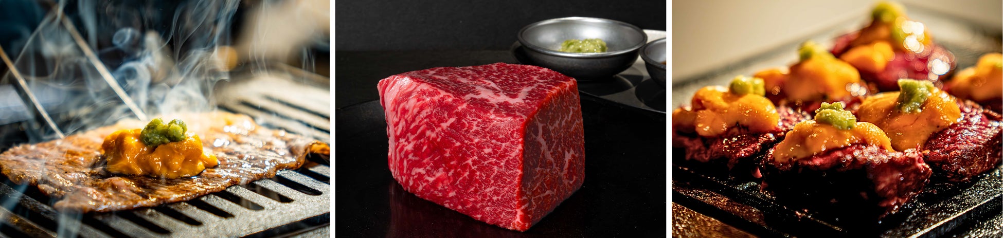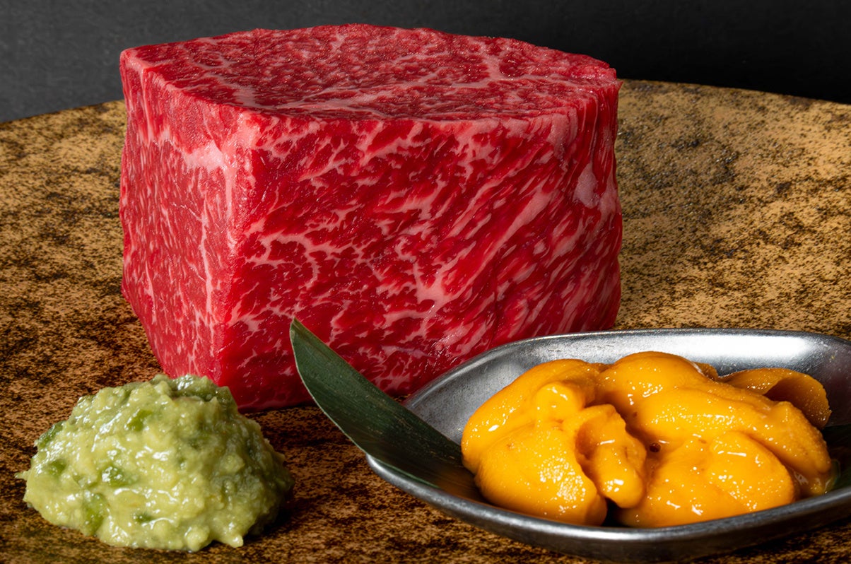 最高級リブロースの芯のみ使⽤した「プレミアムロース」にとろける雲丹を贅沢にトッピング。今回のフェアに合わせ、北海道根室からバフンウニを緊急入荷しました。
