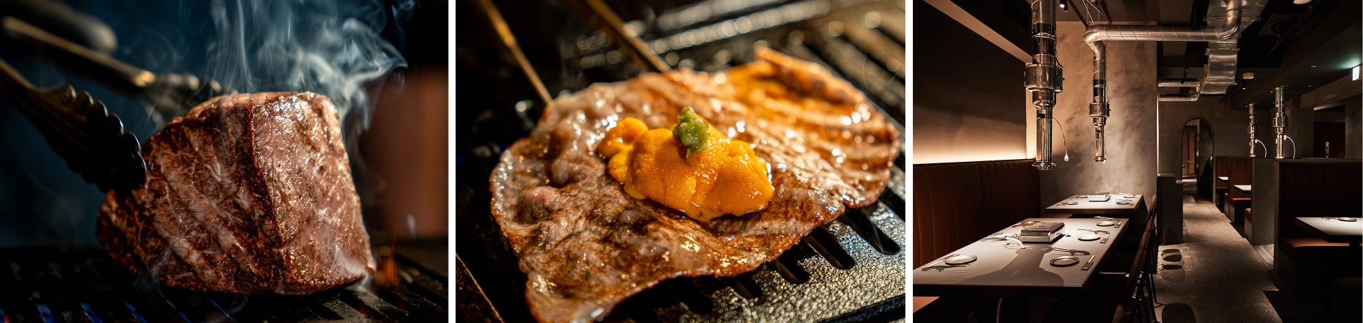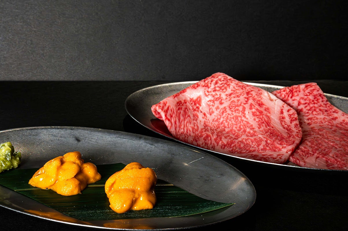「プレミアムロースのウニロール」は、最高級リブロースからわずかにとれる芯の部分を使⽤し、北海道根室から届くバフンウニを合わせた贅沢メニュー。ロース部位の中でも最もきめ細かくやわらかな肉質のリブ芯をロースターでさっと焼き、たっぷりのウニを巻いて口にほおばると、とろける食感の肉の脂と濃厚なウニの旨味が広がります。賞味期限わずか10秒、至福の瞬間を堪能いただけます。