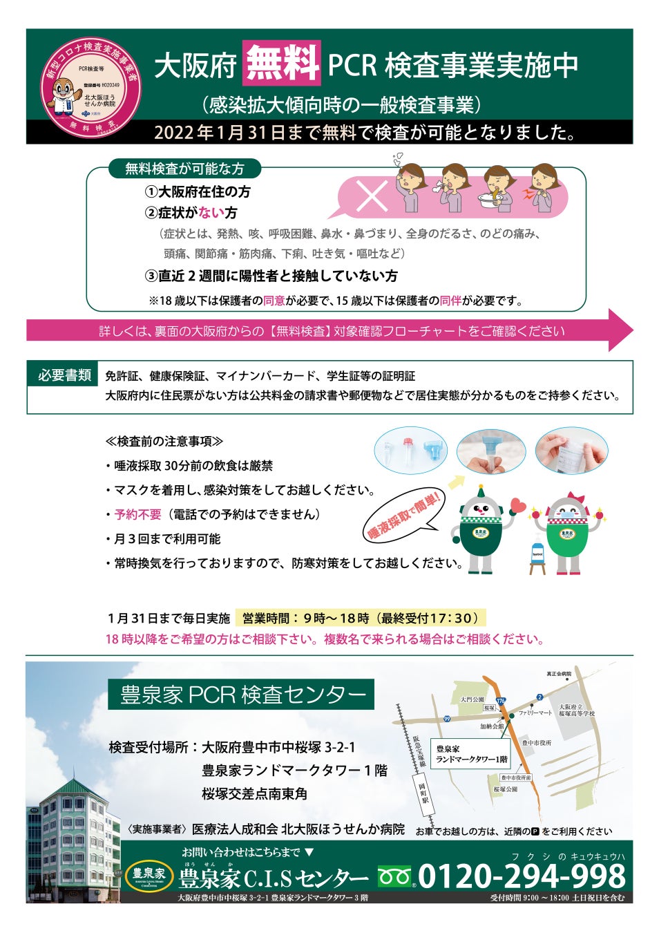 豊泉家(ほうせんか)グループは、大阪府新型コロナウイルス感染症無料検査事業者として、2022年1月15日(土)より、豊泉家ランドマークタワー(所在地:大阪府豊中市中桜塚3-2-1)にて、無料PCR検査を実施しております。