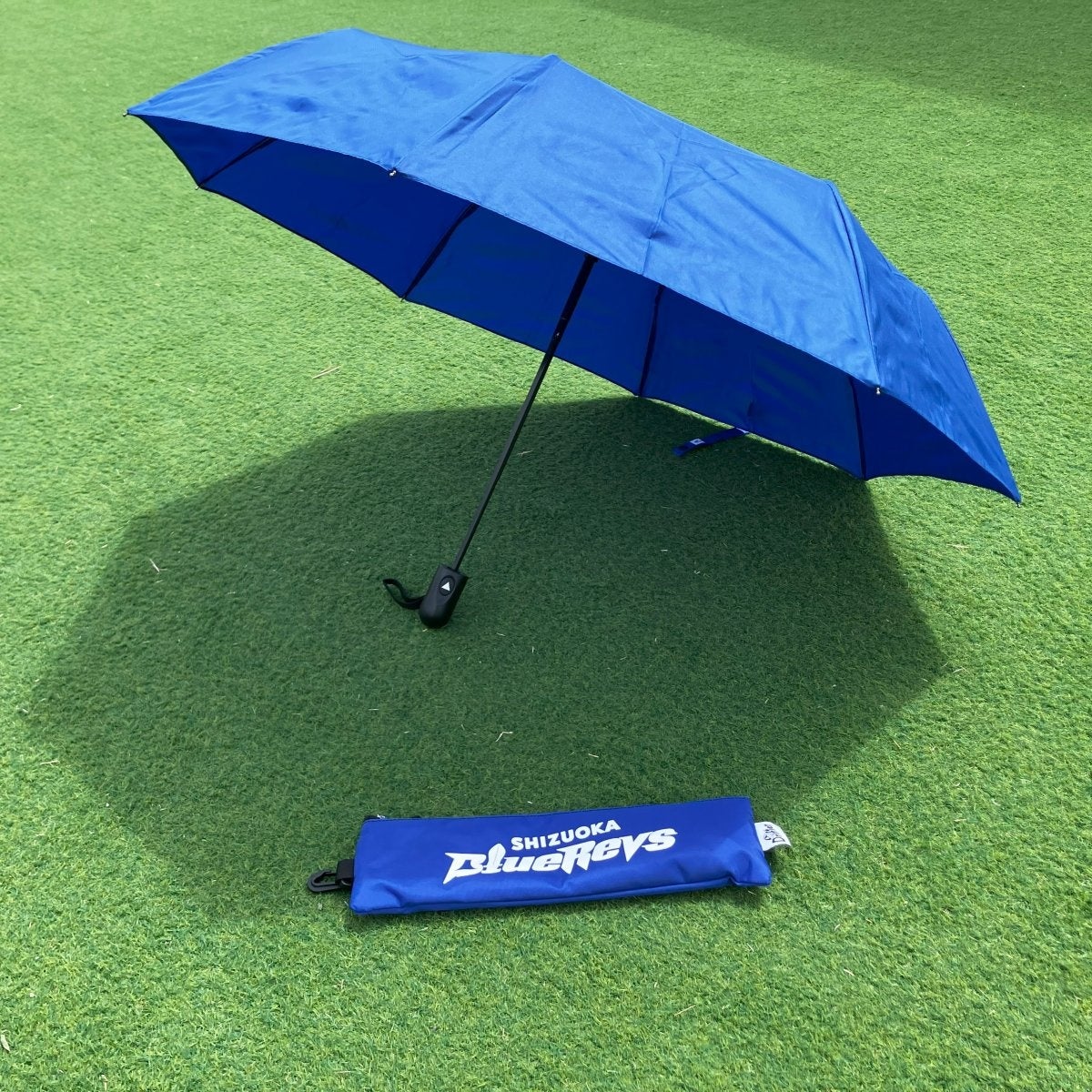 持ち手のボタンをワンプッシュで傘を開く事ができます。撥水加工とUVカット仕様はもちろん、Drifterらしいフック付の専用収納ポーチが付属し、大きな静岡ブルーレヴズのロゴがプリントされています。