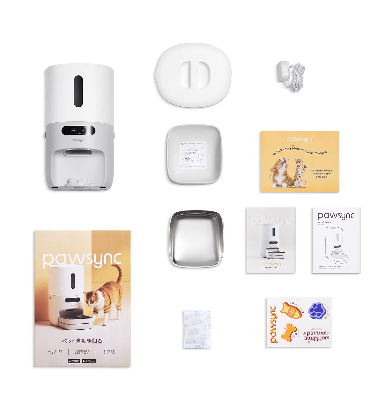 Pawsyncペット自動給餌器本体 / ステンレス製ボウル / スケール / 電源アダプター / 乾燥剤パック / 取扱説明書 / クイックスタートガイド / Pawsyncステッカー