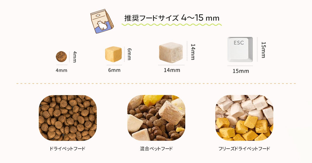 多種な餌に対応:一般的なドライフードからフリーズドライフードまで対応します。ペットの嗜好や健康状態に合わせた柔軟な食事管理が可能です。