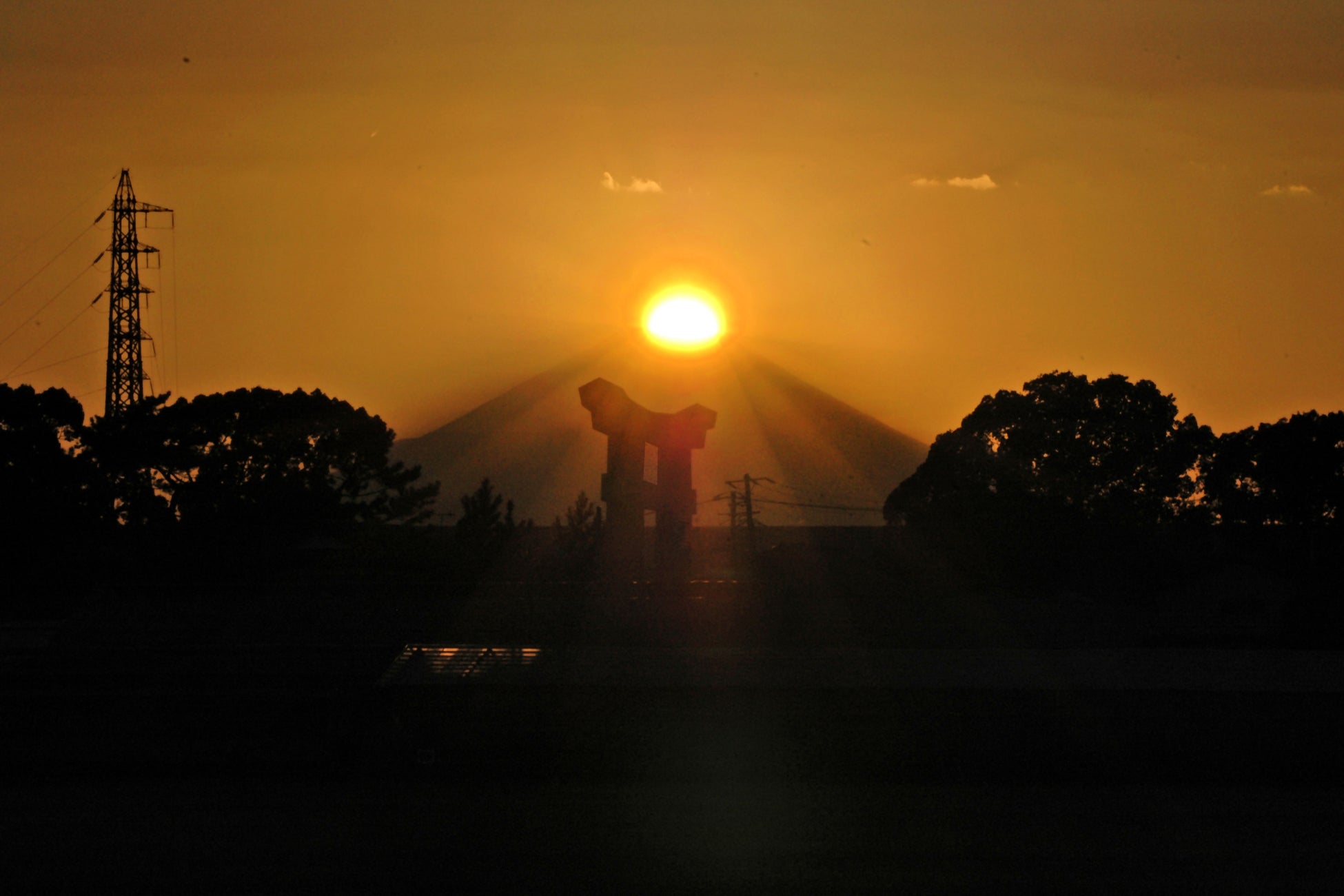 3月20日(木)の春分の日には、寒川神社付近でダイヤモンド富士をみることができます。これは、寒川神社から見て真西の方角に富士山がそびえていることによります。