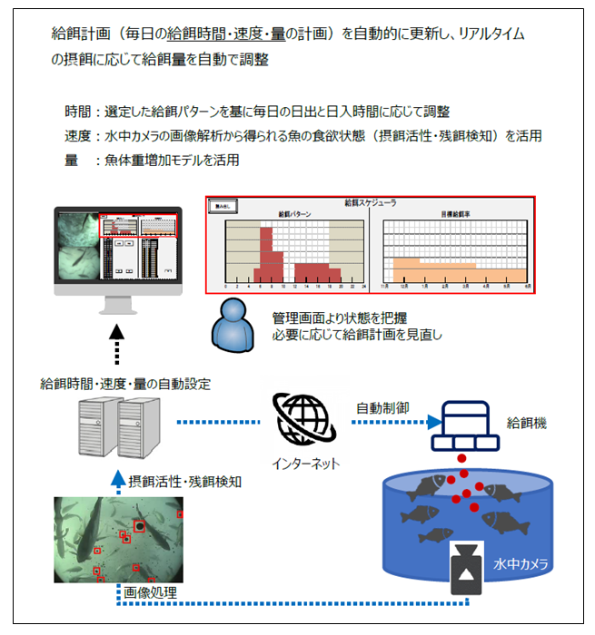 ※2 水中カメラ・環境センサー・通信機器・データサーバなどのハードウェアおよび画像解析プログラム・給餌制御プログラムなどのソフトウェアから構成される給餌最適化のためのシステム。2022年3月より同システムを設置し、当社と泉澤水産で共同試験中。システムの概要は以下参照。
