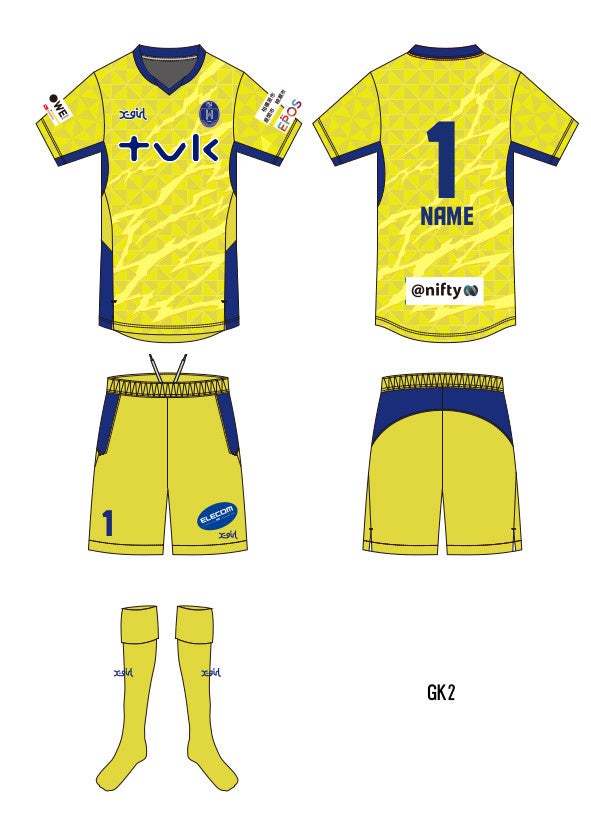 ベースに敷き詰めた幾何学模様と、そのうえを走る稲妻が対照的な印象のユニフォーム。幾何学模様は相模原市の花「アジサイ」に着想を得たもの。アジサイの花言葉には「団欒」「和気あいあい」といった明るいものと、雨の中を静かに耐えて咲き続ける姿から「辛抱強い」「無情」などのクールな意味を合わせ持っており、これをベースに敷き詰めることでクラブの絆の結束力・仲間の温かさと、プレーでの精悍さを同時に表現しました。