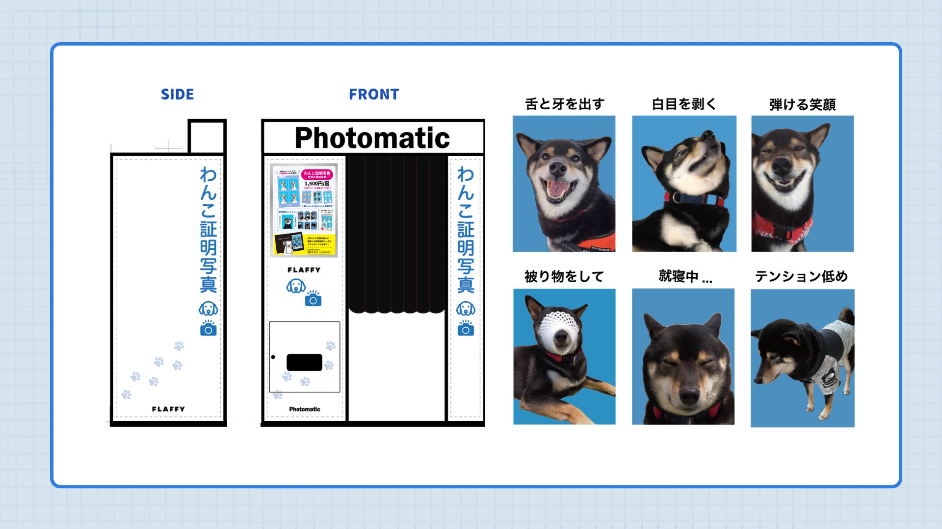 『わんこ証明写真』は昨年秋にイベント限定で設置させていただいた際に、最長5時間も並んでいただくほどの大盛況に終わりました。その後もたくさんの愛犬家の方から「イベント以外でも撮りたい!」「イベントでは人気過ぎて撮れなかった」といった声をいただき、今回常設化に向けた新規事業を開始いたしました。ぜひ、愛犬のかけがえのない今を切り取っていただければ幸いです。そしてこれからもペットとヒトが共に楽しみ、お互いの時間を共有していく、そんな幸せな空間をお届けできたらと思います。
