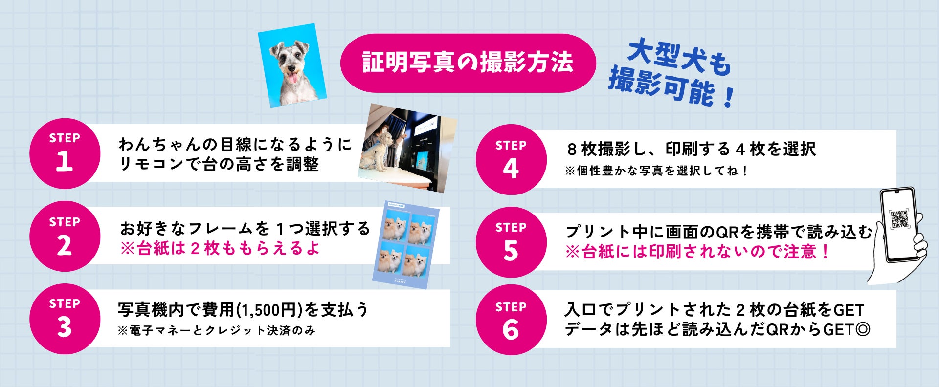 わんこ証明写真の撮影方法は、基本的に人間用と同じです。台の高さの調整も簡単にできるため、小型犬から大型犬までどんなわんこでも撮影が可能です。8枚撮影した後に印刷する4枚を選択できるので、ぜひ様々な表情で撮影してみてください。※撮り直しはできないので、上手くいった写真はもちろん、上手くいかなかった写真も大事な思い出の一コマとしてお楽しみください。