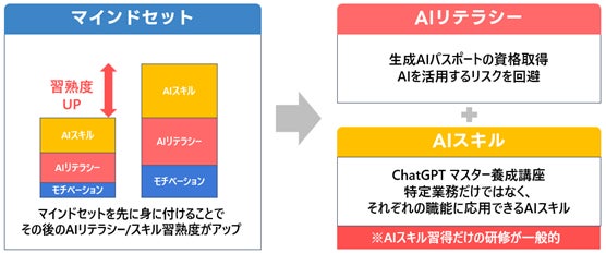 ・研修内容 :①リスキリングのマインドセット講座+②「生成AIパスポート」講座(資格取得)+③ChatGPT マスター養成講座