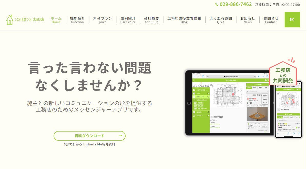 工務店向けコミュニケーションアプリ「つながる家づくり plantable(プランテーブル)」料金新プラン公開に伴いWebサイトをリニューアル