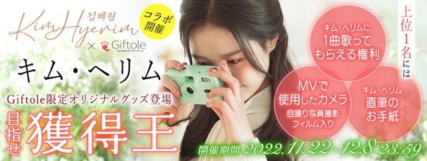 期間中、キム・へリムオリジナルグッズを最も多く獲得いただいた総合獲得ランキング1位の方に、『キム・へリムに1曲歌ってもらえる権利』『MV撮影で使用したカメラ(フィルム入り)』『キム・へリム直筆のお手紙』をプレゼント!