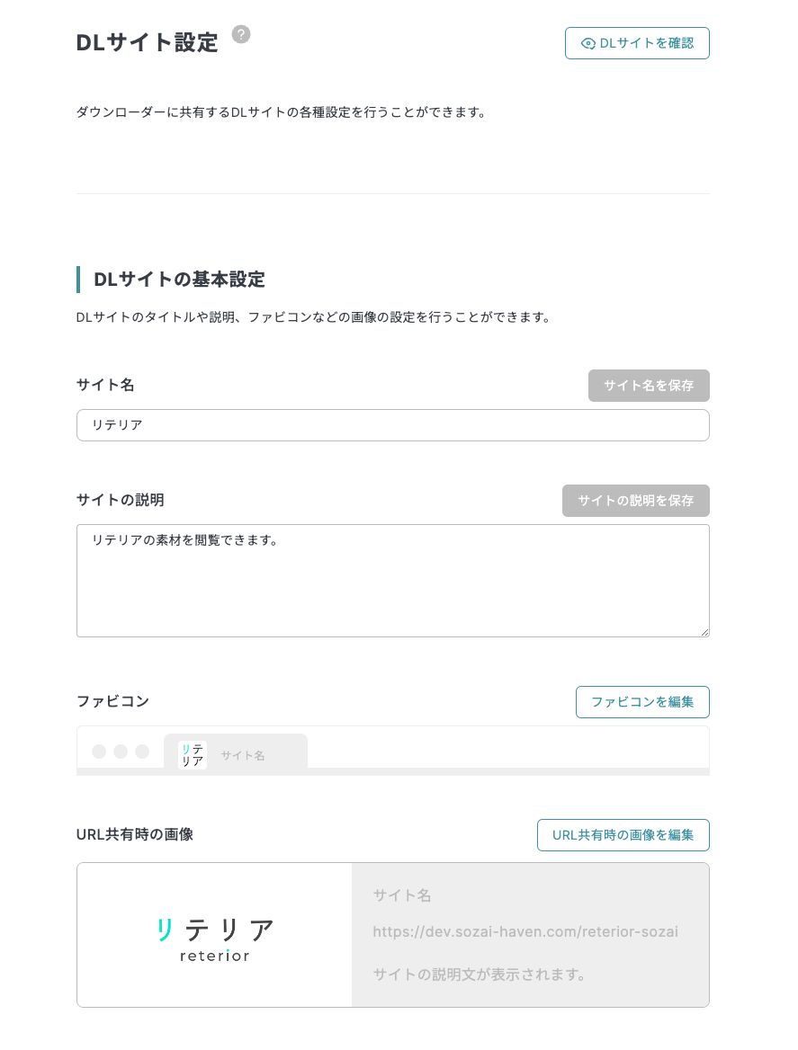DLサイトの基本設定では、サイトのタイトルや説明、ファビコン、URL共有時の画像を設定することができます。