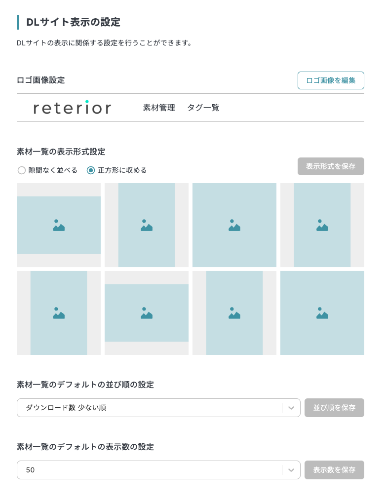 また、DLサイト表示の設定では、サイトのロゴや素材一覧のレイアウト、デフォルトの並び順・表示数をそれぞれ設定することが可能です。