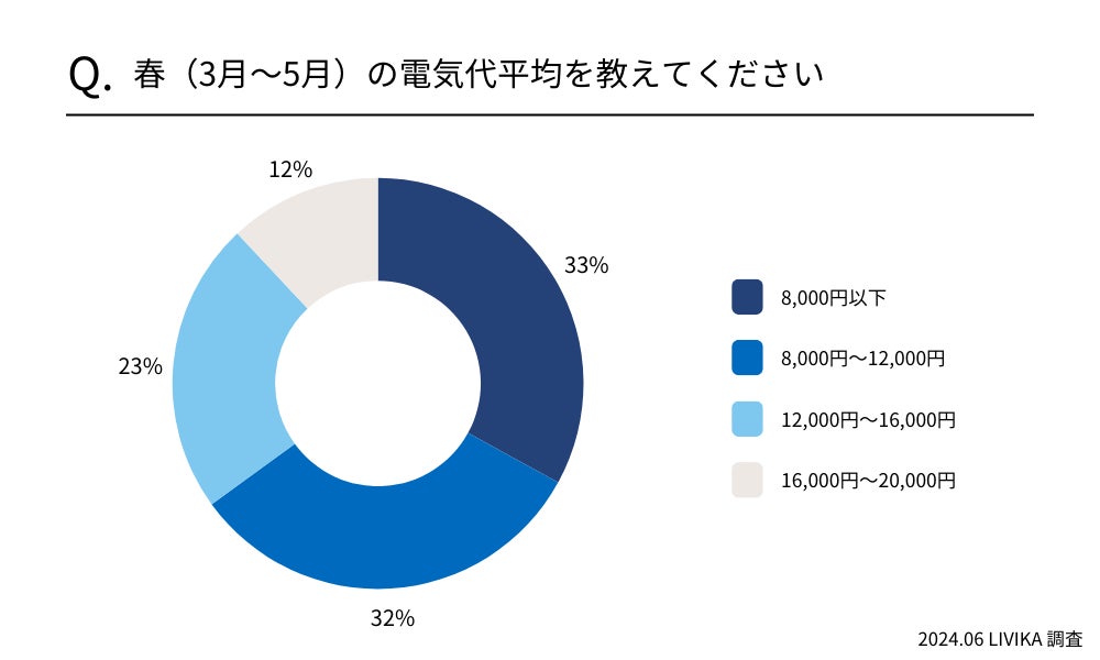春の電気代は「8,000円以下」と回答した方が33%、次点で「8,000円~12,000円」が32%という結果となっています。