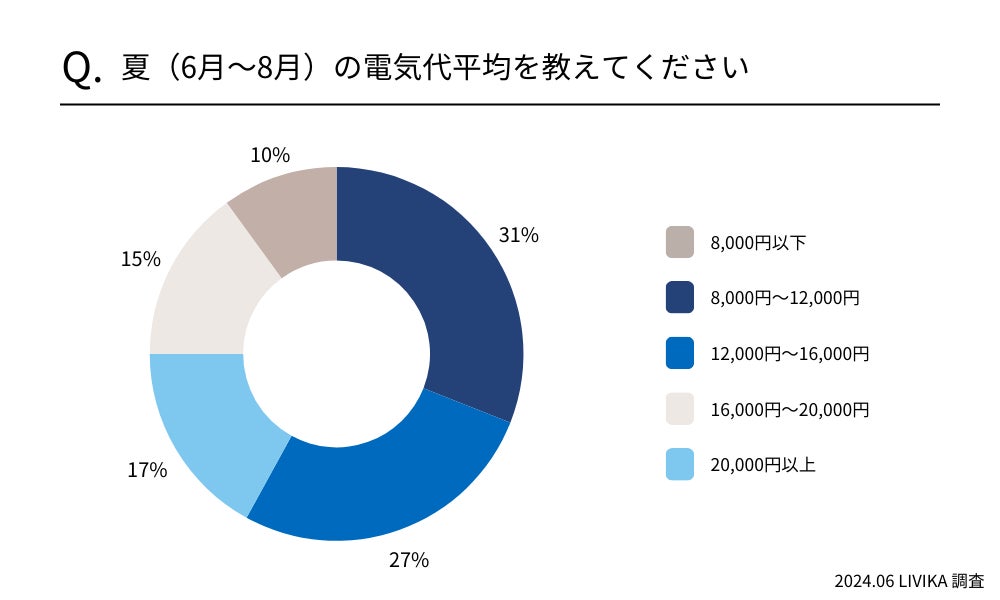 夏の電気代は「8,000円~12,000円」が31%、「12,000円〜16,000円」が27%という結果となりました。