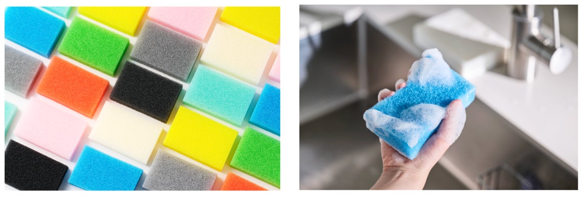 ダイニチ・コーポレーションは創業から、食器洗い用固形洗剤の製造販売を行っています。製造から販売を行う中で、固形洗剤と相性の良いスポンジを研究し、高品質ポリウレタンを使用した、従来のスポンジの概念を覆す「サンサンスポンジ」が生まれました。半年以上使えるほど丈夫で長持ちなので、ごみの削減に。