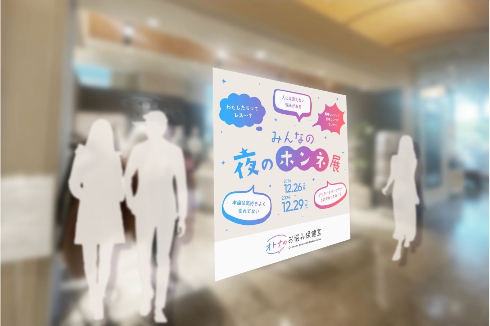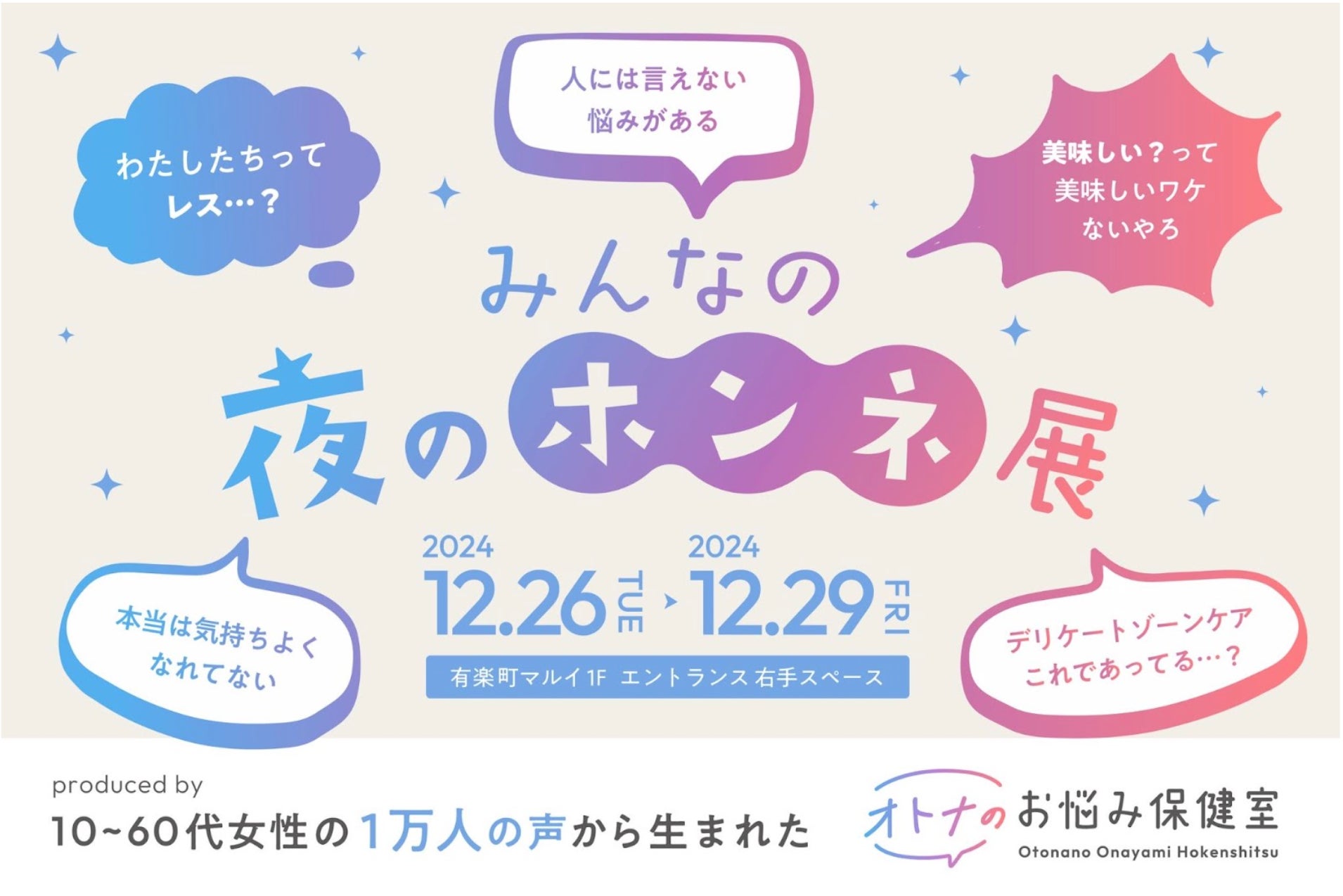 当サービスが開催する『みんなの夜のホンネ展』は、「性にまつわる悩みを持つのは自分だけではない」という発見を届けることを目的とした展示、豪華ゲストによるトークショー、またお悩みの解消に繋がるブランドコラボによる商品の展示と販売を行うイベントです。