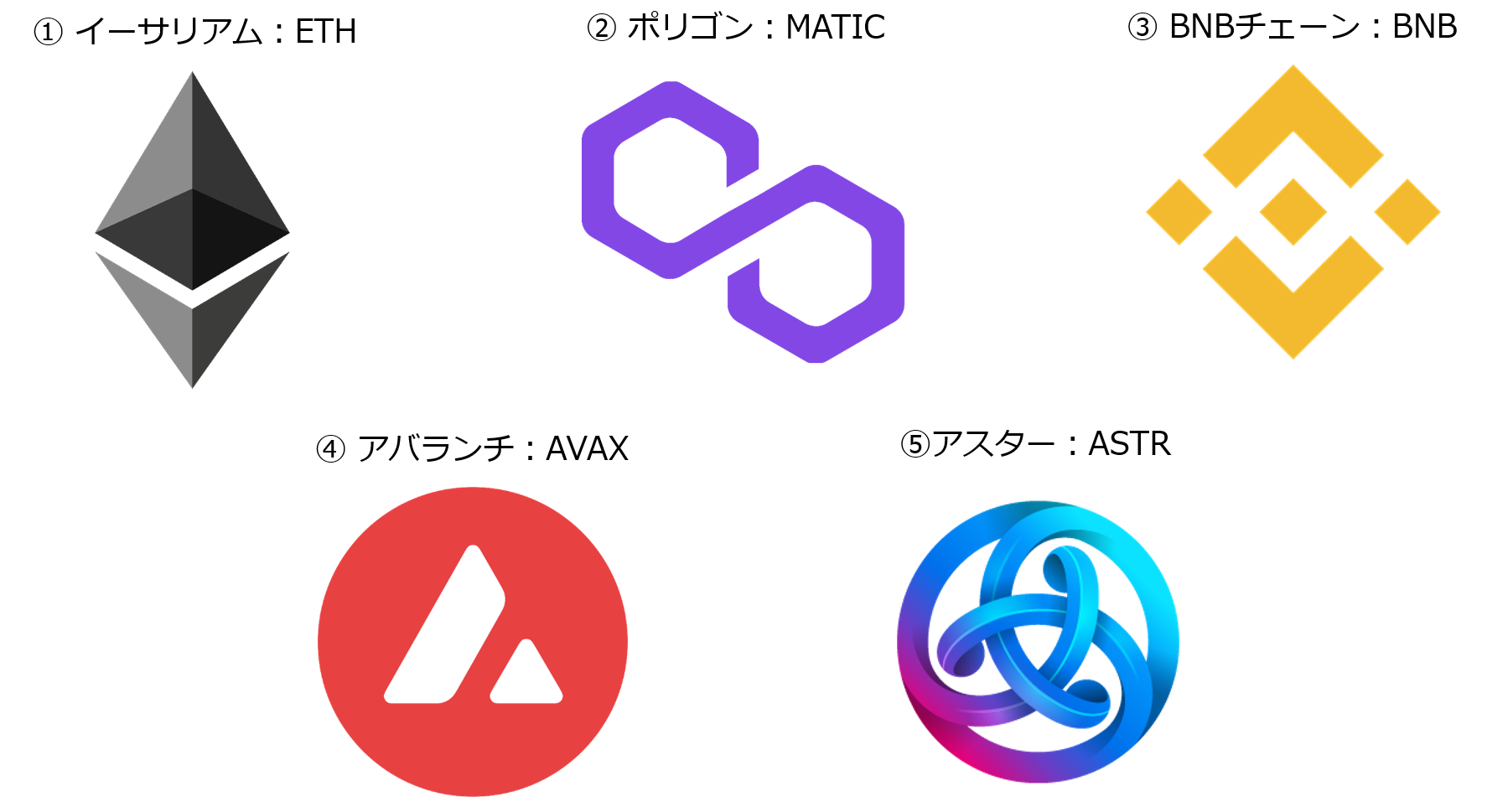 様々なブロックチェーンゲームやGameFiのプロジェクトニーズをカバーできる5つのメジャーなマルチチェーン(イーサリアム:ETH、ポリゴン:MATIC、BNBチェーン:BNB、アバランチ:AVAX、アスター:ASTR)でNFTの販売が可能です。