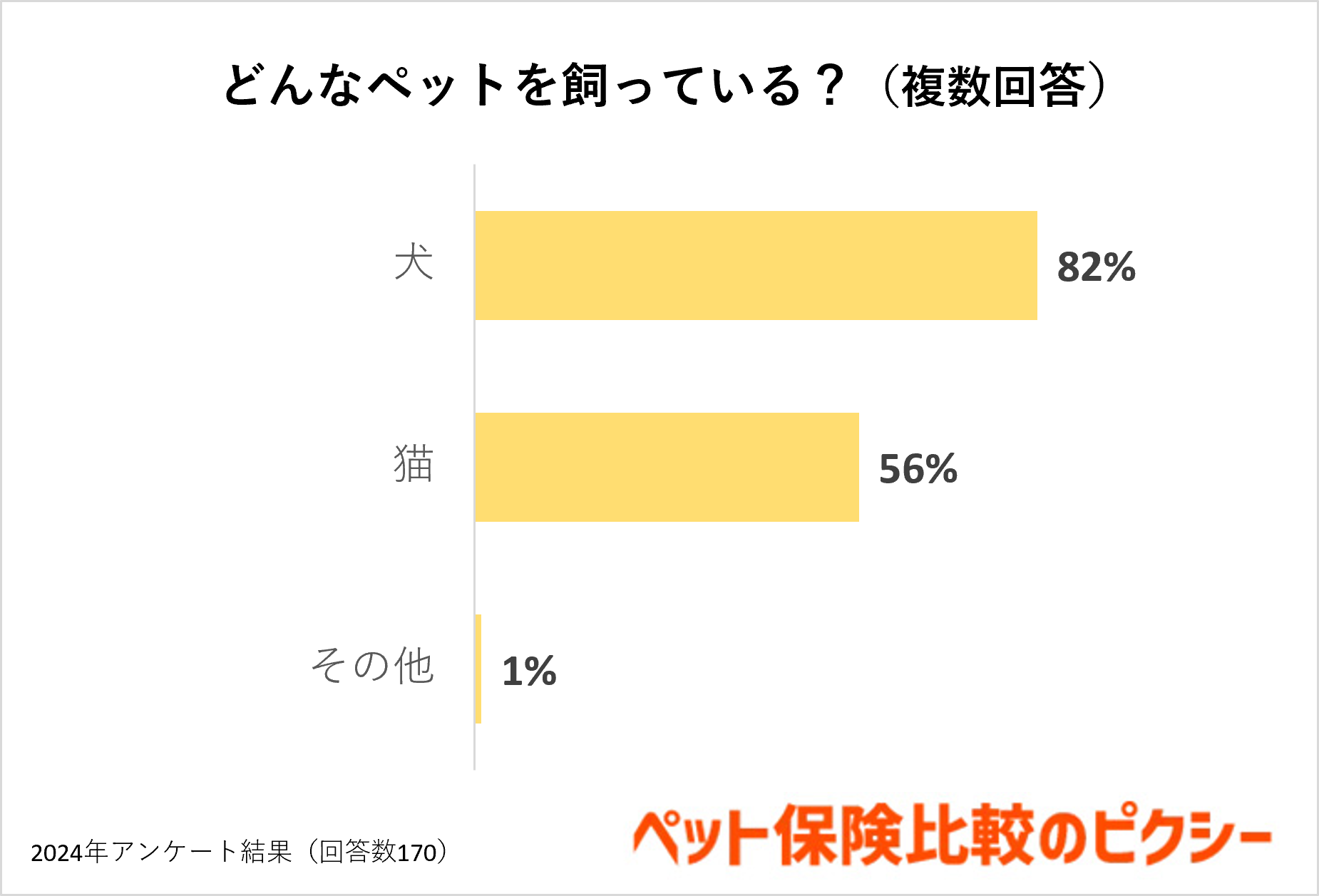 どのようなペットを飼っているかを質問したところ、犬を飼っていると答えた方が82%、猫を飼っていると答えた方が56%、その他の回答が1%でした。