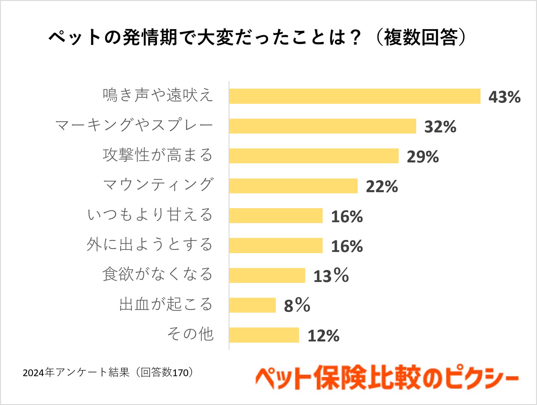 ペットの発情期で大変だったことを聞いたところ、1位は「鳴き声や遠吠え(43%)」でした。