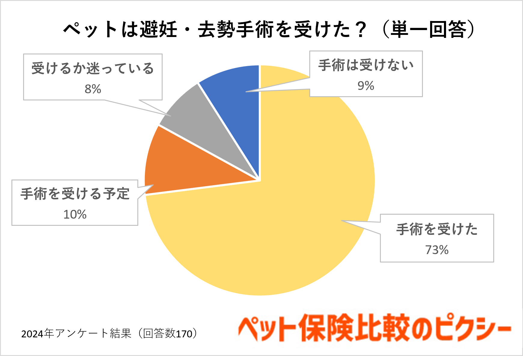ペットが避妊・去勢手術を受けたかの質問には「手術を受けた」と答えた方が一番多く、73%でした。