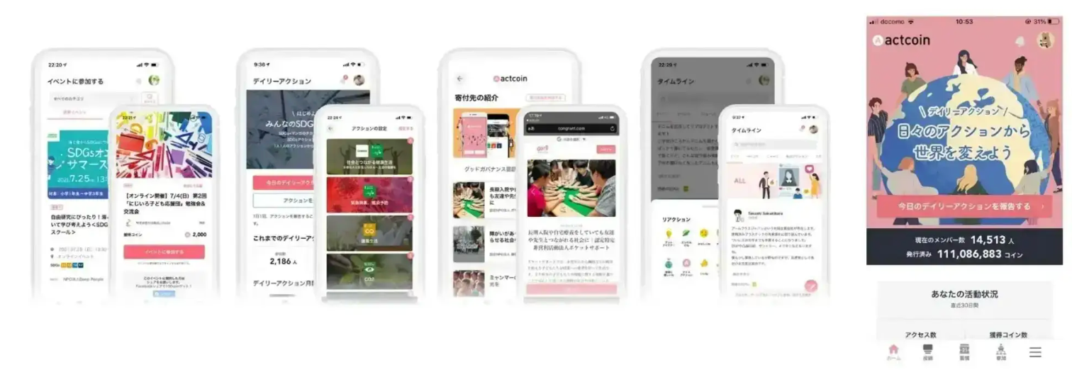 「actcoin」は、ユーザーがオンライン・オフラインで社会貢献活動に参加するたびにデジタルポイント(以下、コイン)が付与されるアプリケーションサービスです。例えば、ボランティアへの参加・寄付などの実践報告を行うことでコインが付与されます。