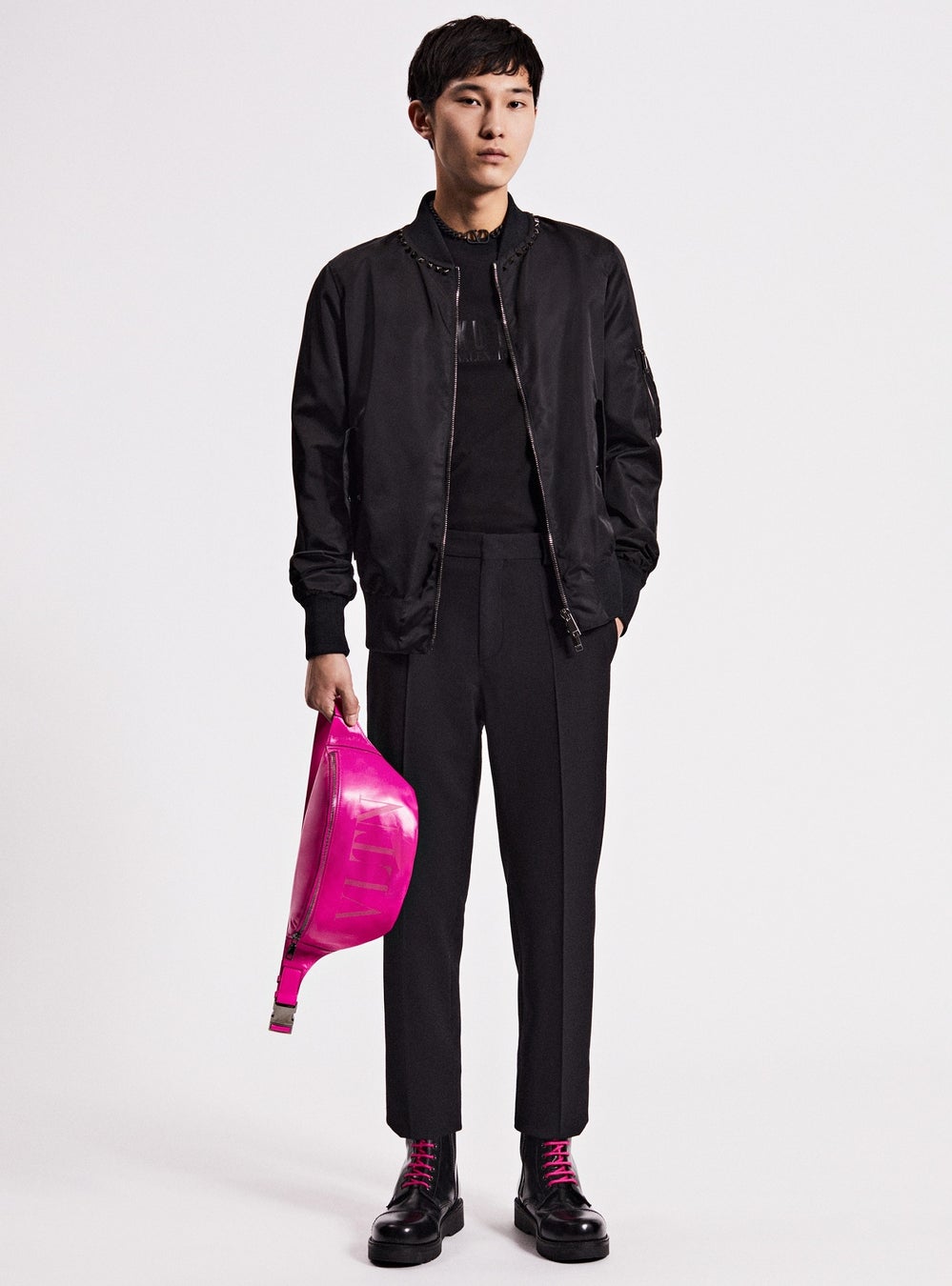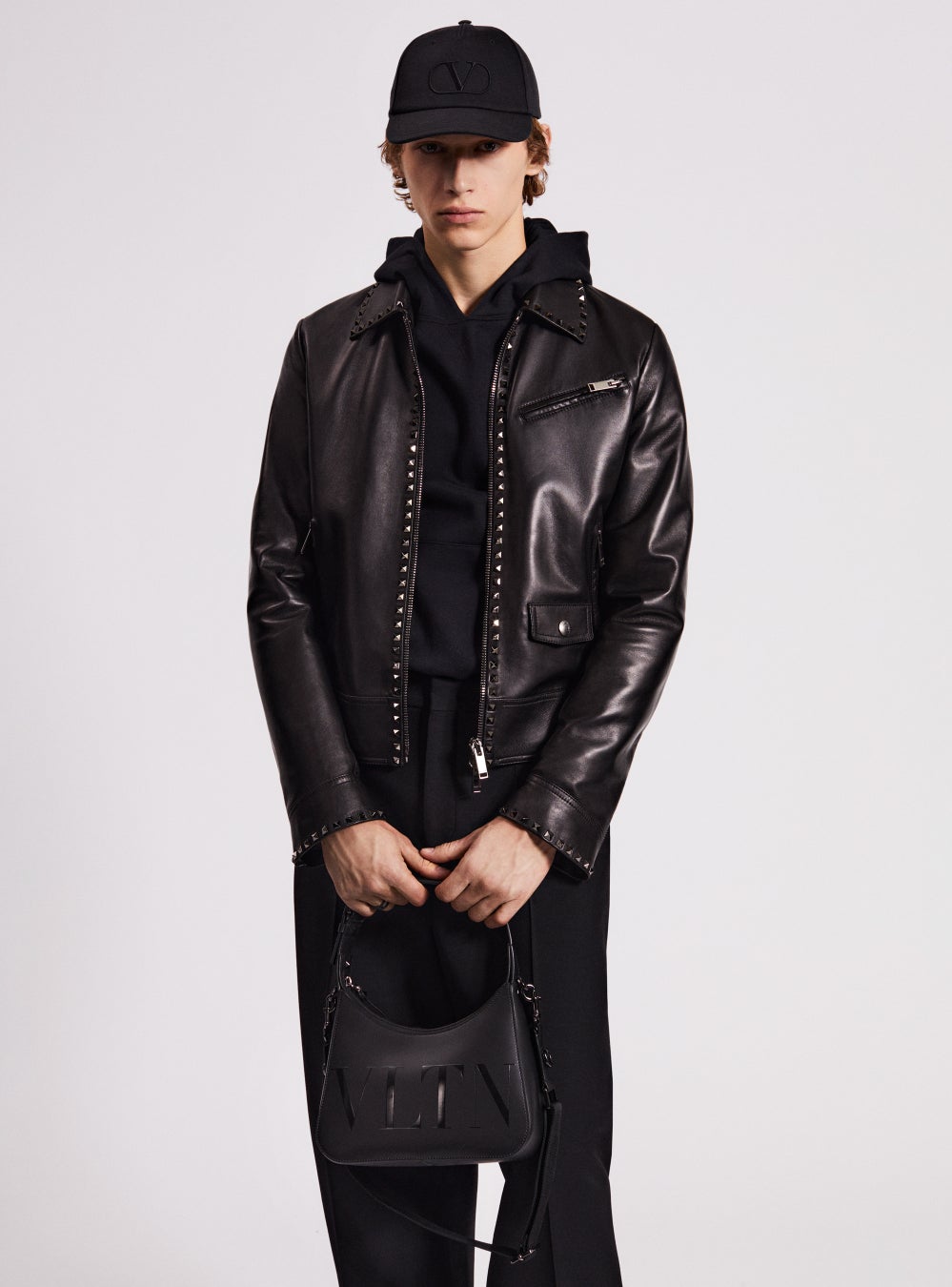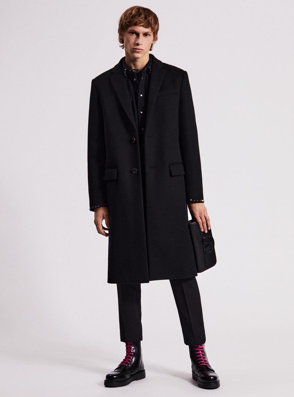ワードローブの定番アイテムをアイコニックなスタッズによって再解釈した ‘ロックスタッズ アンタイトルド’ は、ダブルコート、トレンチコート、シャツ、バイカージャケット、Tシャツ、スウェットシャツ、パンツ等の商品で構成されています。それぞれのアイテムの内側には、商品の種類ごとに異なる数字がプリントされた特別なラベルが取り付けられています。今シーズン登場した新作のブラックエディションでは、ブラックルテニウム仕上げのアンタイトルドスタッズがウェアに都会的で洗練されたアティチュードをもたらします。スタッズのディテールからはヴァレンティノのアイデンティティをはっきりと感じ取ることができます。