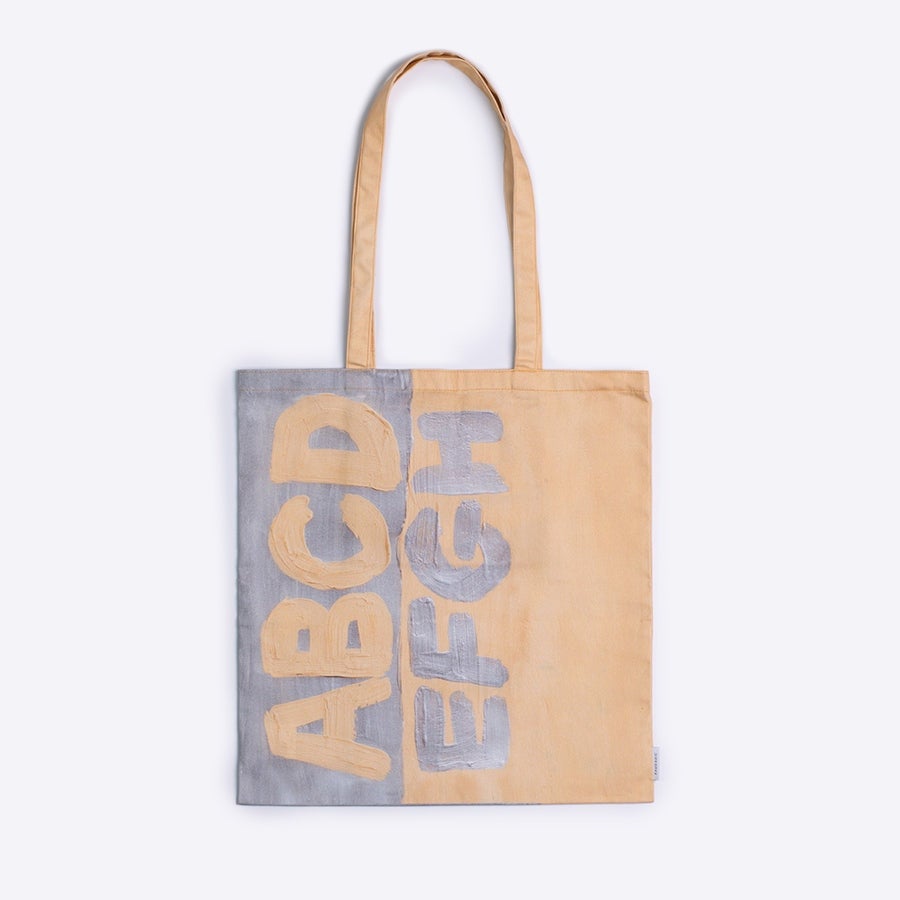 アルファベットの形に注目し、文字を図形として描いた。 鏡合わせのような淡いオレンジとシルバーの対比。