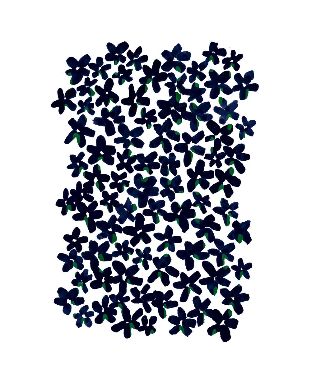 様々な種類の花で作られたブーケを描いた。白い花は暗闇の中で光っている。