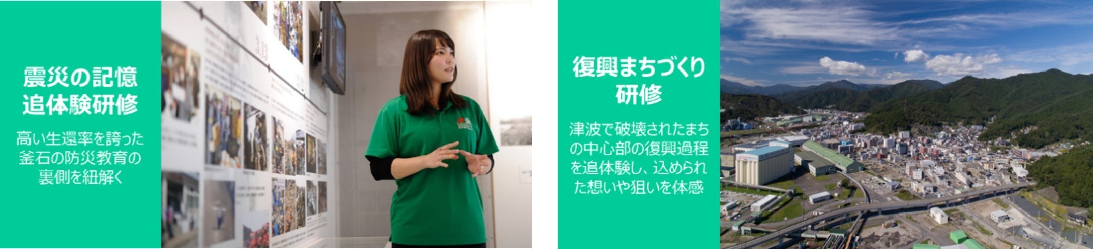 釜石市では、企業からの研修型の受け入れを中心に、釜石ならではの「研修」「体験プログラム」によって学びを得る『ラーニング・ワーケーション in 釜石』を提供。震災を経験した釜石だからこそ提供できる震災関連の研修プログラムから、リーダー人材育成やチームビルディング、防災意識の向上、また持続可能な観光実践の先進地から学ぶSDGsなど、企業課題の解決に貢献することを目指しています。