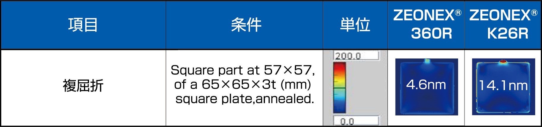 新グレード・ZEONEXⓇ 360Rは、低複屈折が求められる光学レンズ向けにゼオンが独自に開発したもので、主にAR・VRグラスのほか、ヘッドアップディスプレイ、プロジェクター向けレンズ部品としての採用を見込んでいます。ZEONEXⓇ 360Rは、①低複屈折 ②耐光性 ③耐熱黄変性に優れ、特に低複屈折に関しては、従来品の1/3程度に抑えることに成功しました。