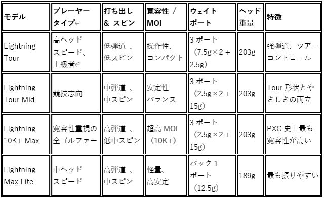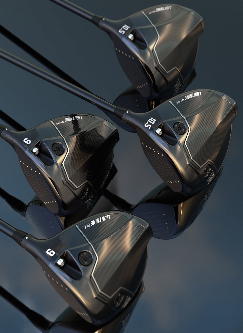 このシステムを支えるのが、スパインドソールデザインと従来比最大84%拡大したカーボンファイバー構造を採用した新設計です。これにより余剰重量をヘッド周辺に再配置でき、展開する4モデルすべてにおいて非常に高いMOIを可能にします。モデルは Lightning Tour / Lightning Tour Mid / Lightning Max-10K+ / Lightning Max Lite の4種を展開。各モデルには PXG精密ウェイト調整システム が搭載され、打ち出し角、スピン量、左右のショット傾向(ドロー/フェード)を自在に調整可能です。中でも Lightning Max-10K+ は、USGA規定上限に迫る安定性を実現しています。