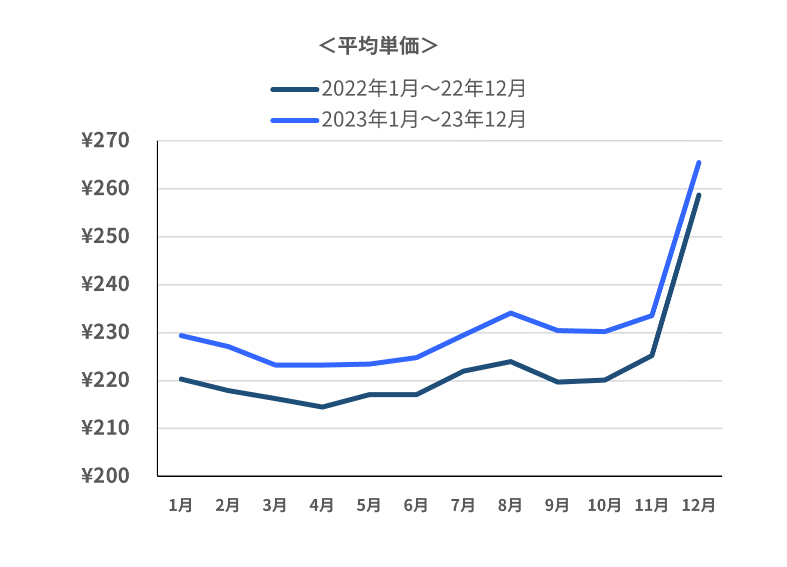 2023年12月のデータを調査した結果、平均購入金額は前年同月比約4.3%(133円)増、前月比約15.1%(421円)増加しています。