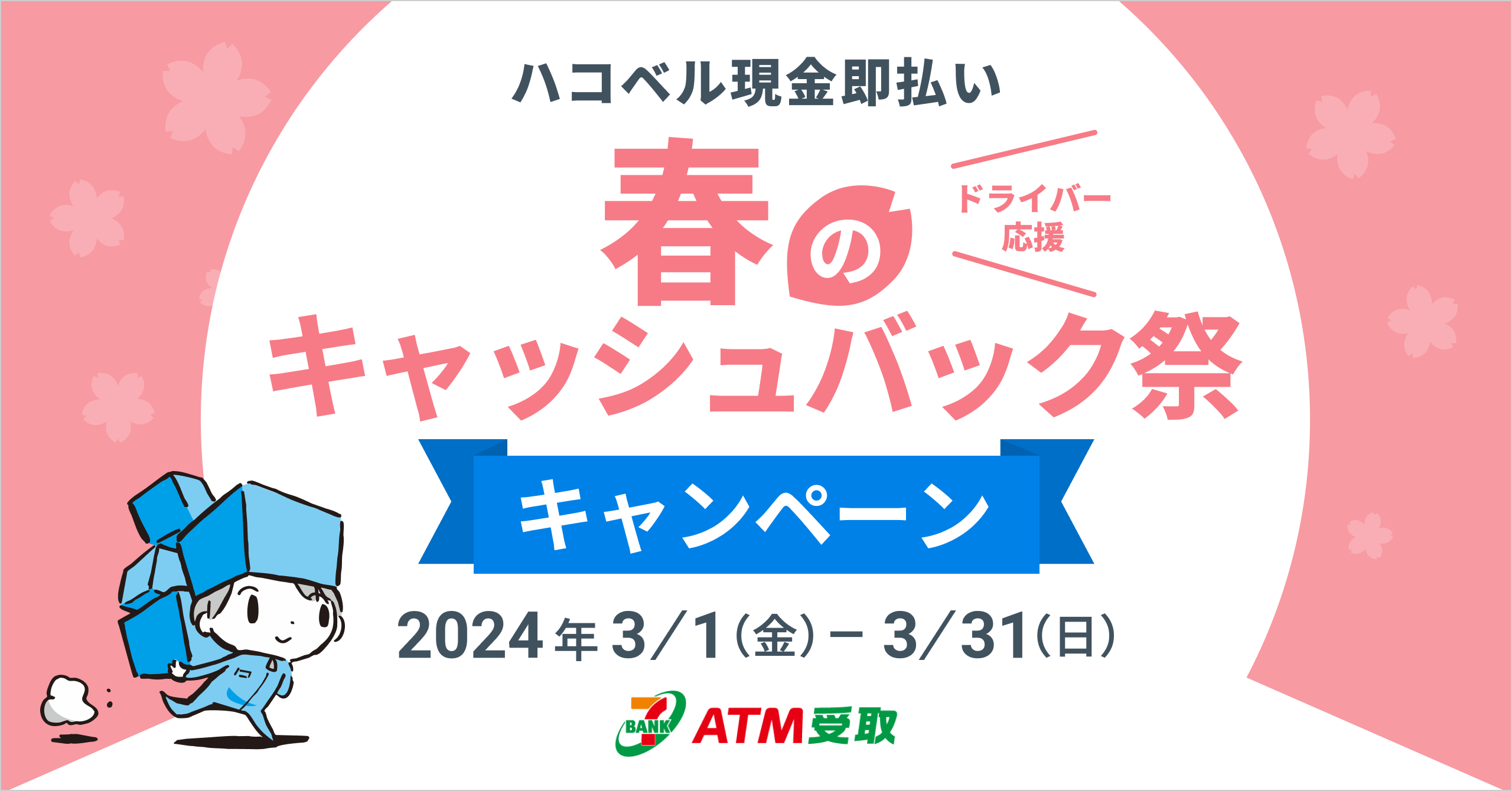 このたび、2024年3月1日(金)~3月31日(日)の期間にわたり、繁忙期のドライバーに感謝と応援の意味を込め『春のキャッシュバック祭』を開催いたします。キャンペーン期間中にドライバーが『ハコベル現金即払い』を利用する際の『ATM受取』手数料分320円を、期間中のご利用回数分、4月にキャッシュバックいたします。