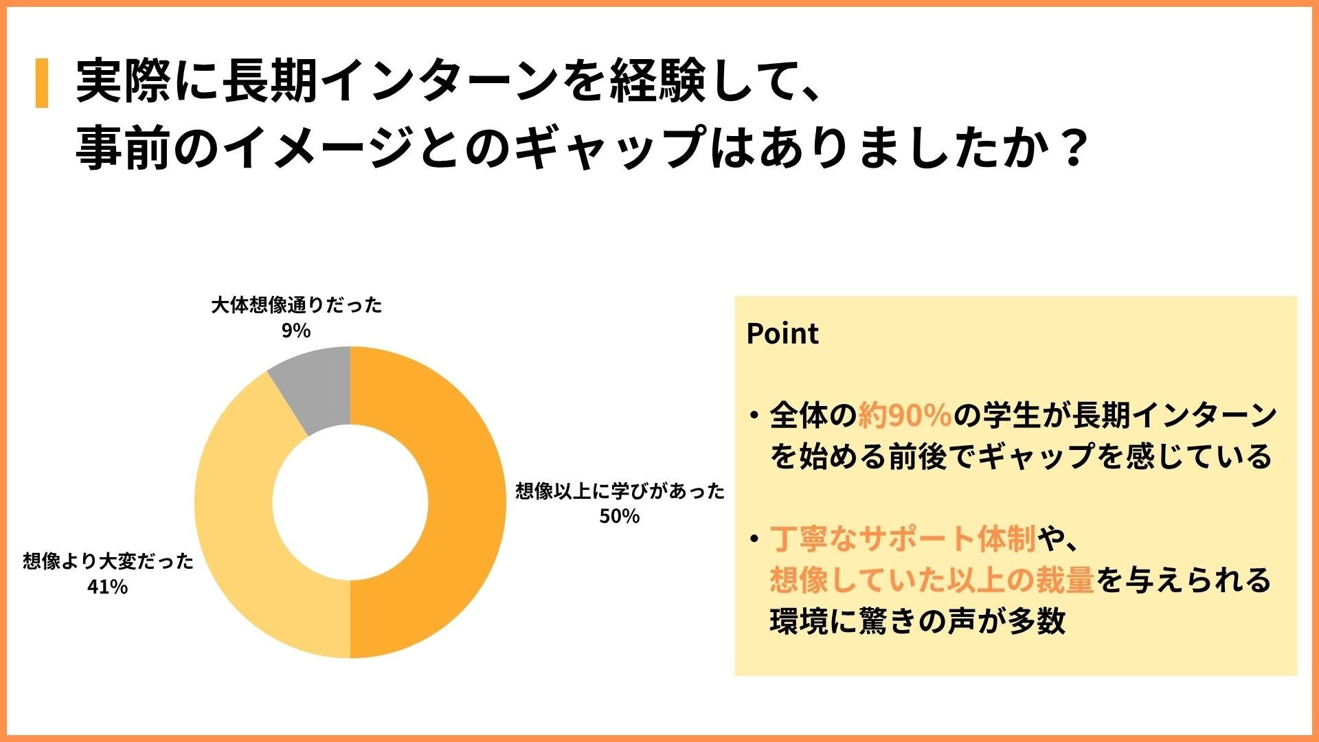 実際に長期インターンを経験する学生の実感としては、早いタイミングで長期インターンに挑戦することに多くのメリットがあるという結果になりました。