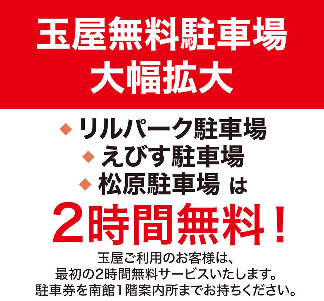 玉屋をご利用のお客様は駐車場が2時間無料!