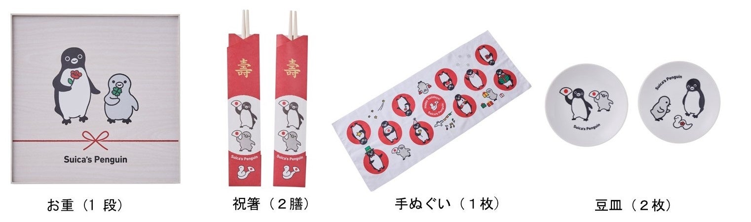 〇Suicaのペンギンや2025年の干支の「へび」がデザインされたお重、祝箸、手ぬぐい、豆皿は全てオードブル限定の