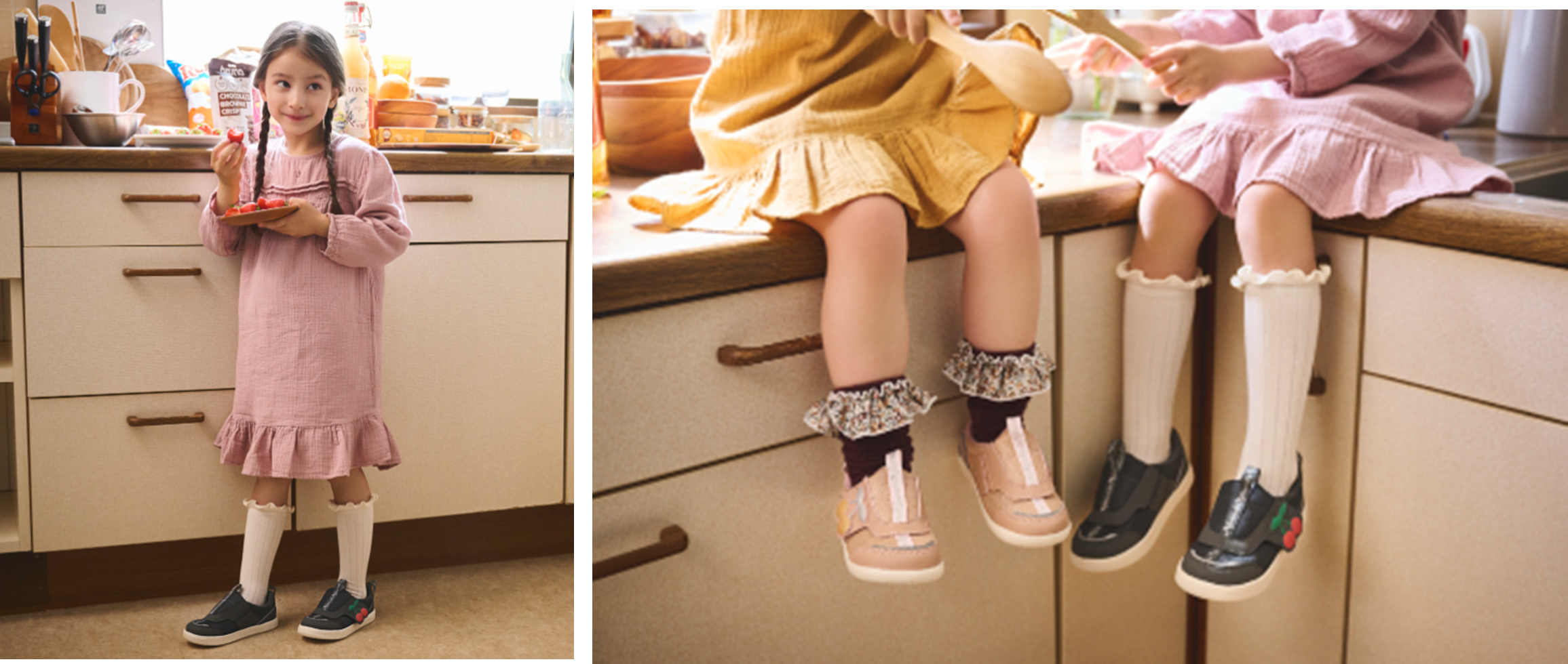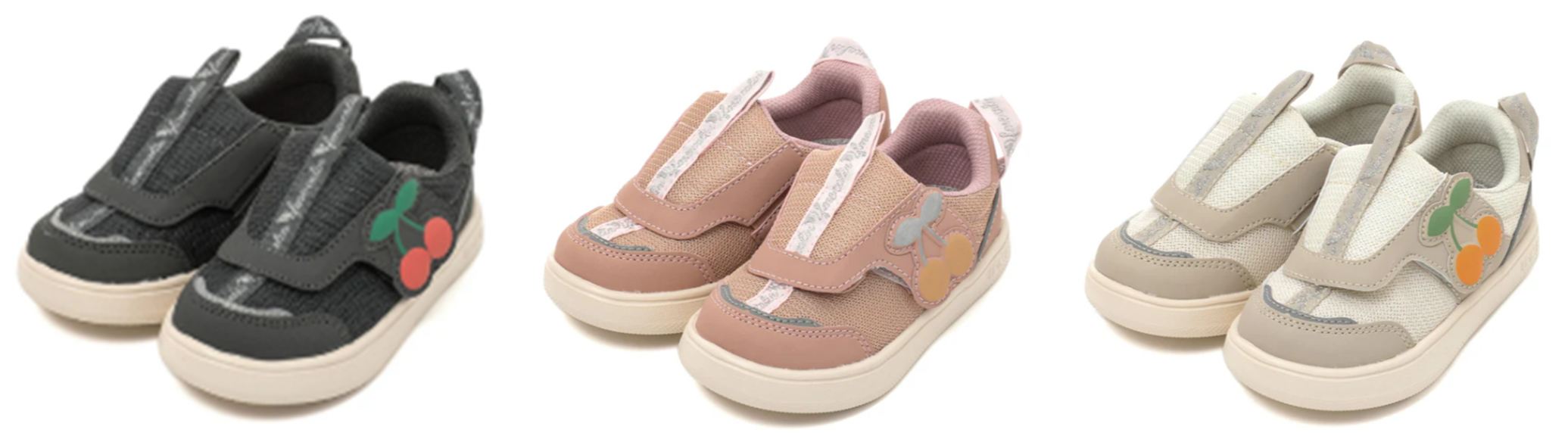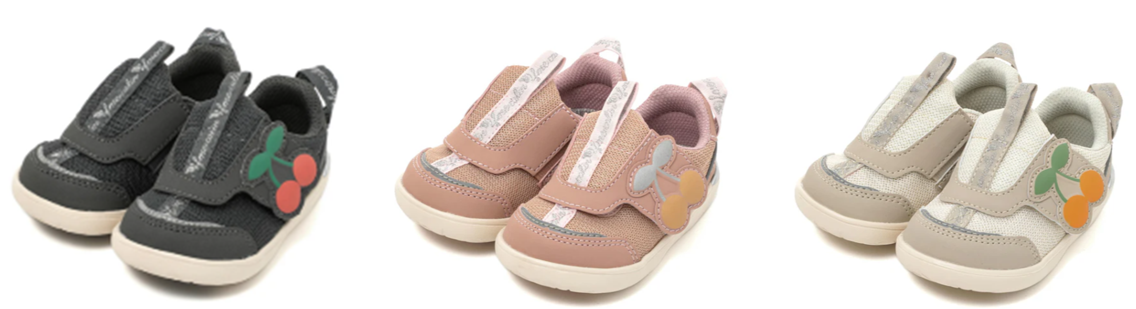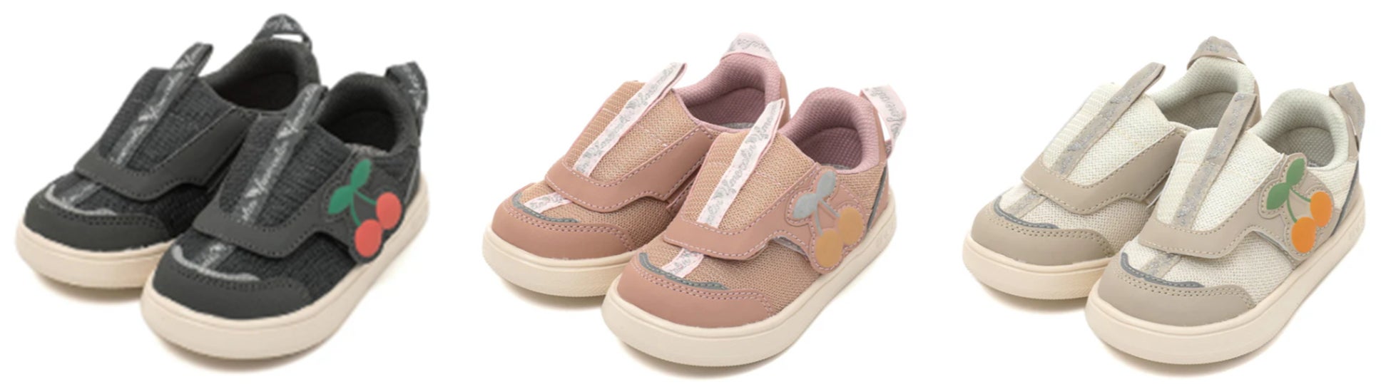 「ifme CALIN ビッグチェリー ifme patto スニーカー」には、ベルト部分に大きな「チェリー」のモチーフをあしらいました。カラーはブラック・ピンク・ベージュの3色を展開。これからの季節にぴったりな、落ち着きのある色合いで、各カラーでチェ―リーの色が異なるかわいらしいデザインになっています。