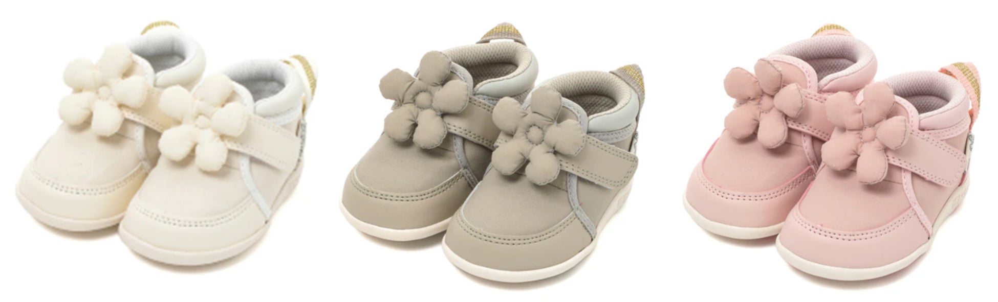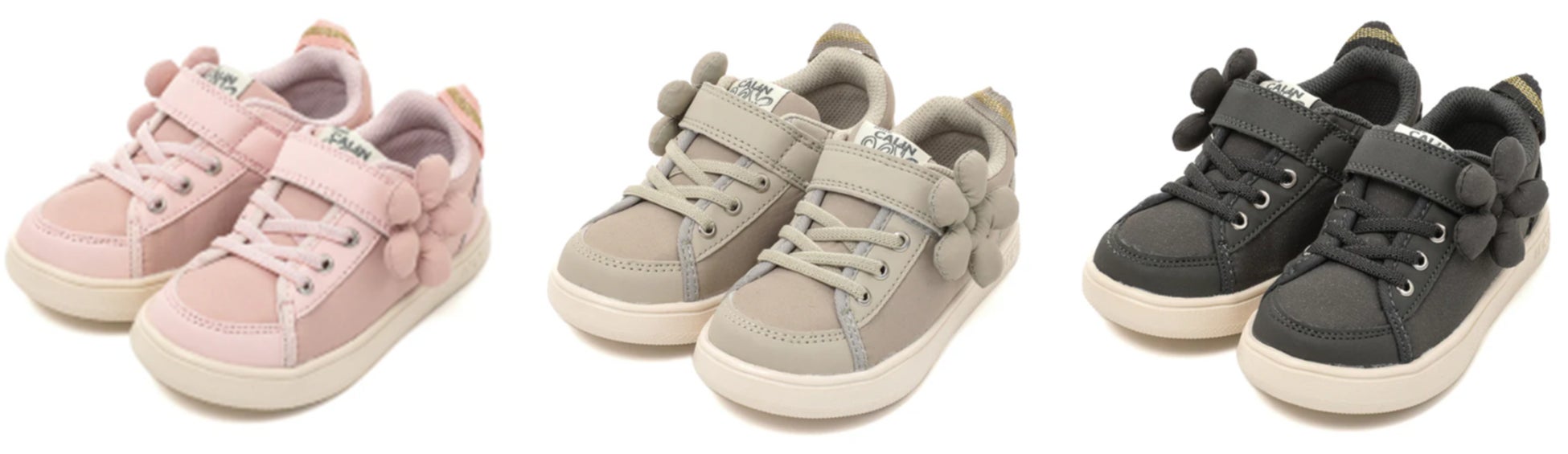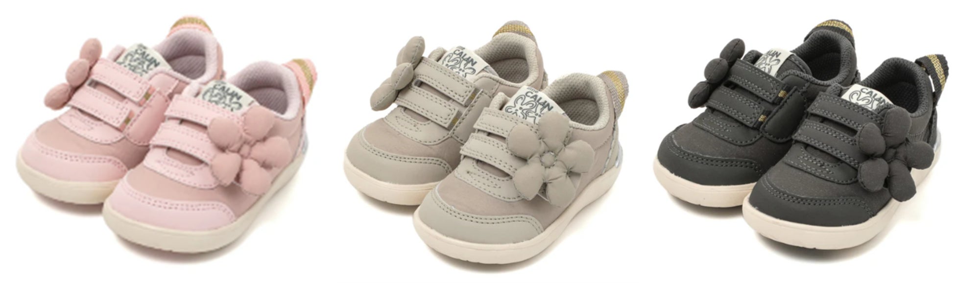 「ifme CALIN wild flower series ビッグフラワースニーカー」は、“日常で見つかる野生のお花”をテーマに、水彩画家の一栁綾乃さんが描くイラストをもとにデザインした「wild flower series」の秋冬モデルです。“初恋”や“真実の愛”を花言葉に持つ、秋の花「キンモクセイ」のモチーフを施しました。綿を入れて優しい手触りに仕上げた立体的なモチーフが、より一層目を引く特徴的なデザインになっています。ピンク・グレー・ブラック(ファーストシューズはホワイト)のカラーバリエーションに、サイズもファーストシューズ・ベビー・キッズと豊富に展開しています。