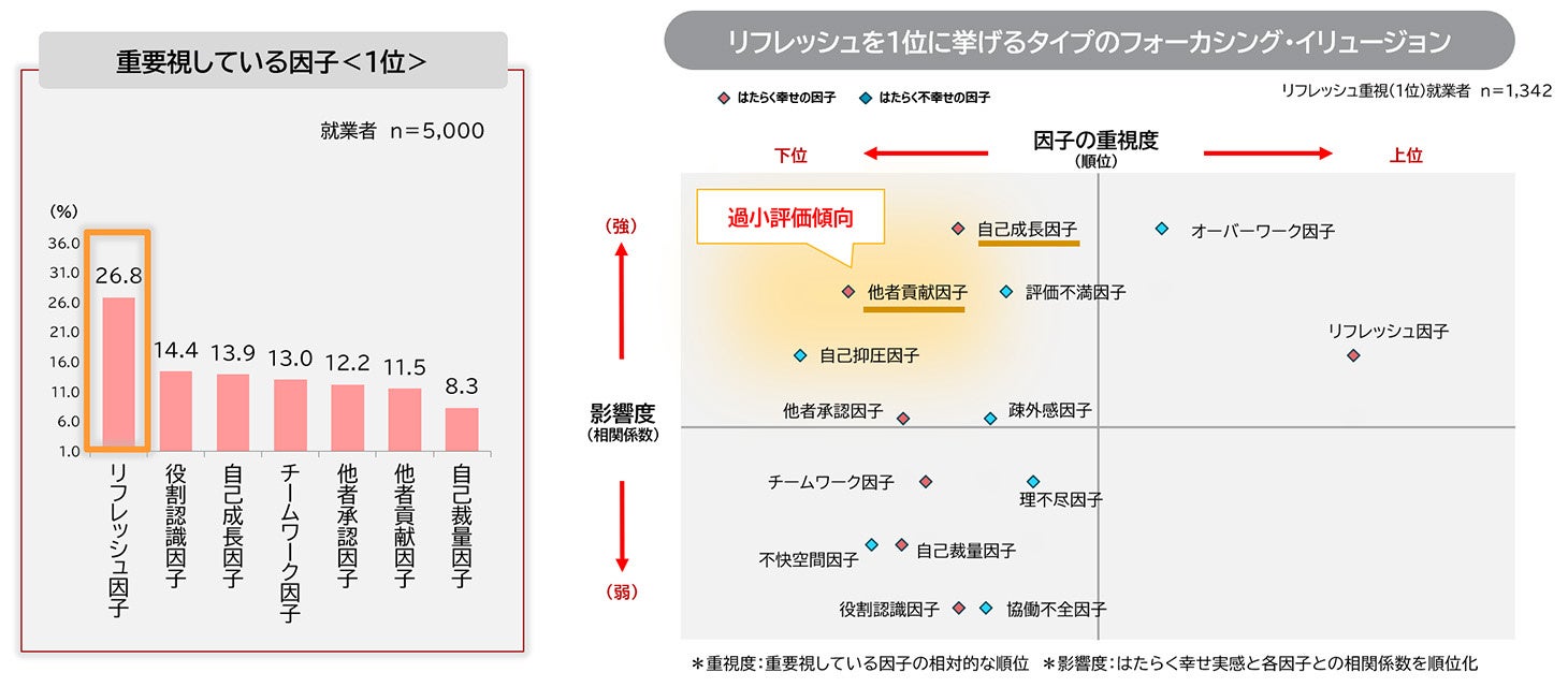 7. フォーカシング・イリュージョン(焦点化錯覚):就業者の26.8%は「はたらく幸せ/不幸せの7因子」の中で「リフレッシュ因子」が最も重要だと回答。この群は他因子を低く評価し、リフレッシュ因子を過大評価する傾向が確認された。