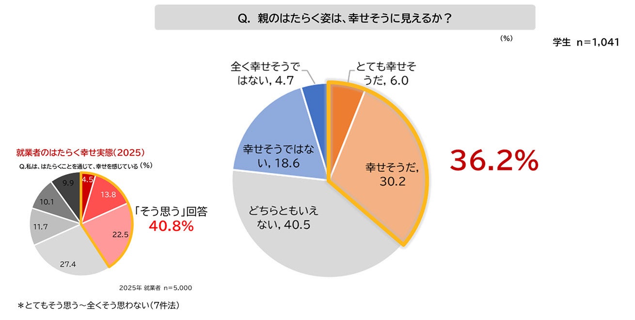 5. 親のはたらく姿:学生(高校生~大学院生)に対し、親のはたらく姿(働いていて幸せそうに見えるか)について印象を確認した。全体の36.2%は「幸せそうだ」と回答したものの、23.3%は「幸せそうではない」と回答した。この傾向は、就業者自身が感じている主観的幸福感(40.8%)と近似しており、親世代の働き方や職業生活実態が、家庭生活を通じて子どもにも伝わっている可能性が示唆される。