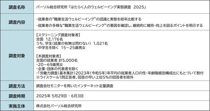 株式会社パーソル総合研究所(本社:東京都江東区、代表取締役社長:岩田 亮)は、「はたらく人のウェルビーイング実態調査 2025」の結果を発表いたします。