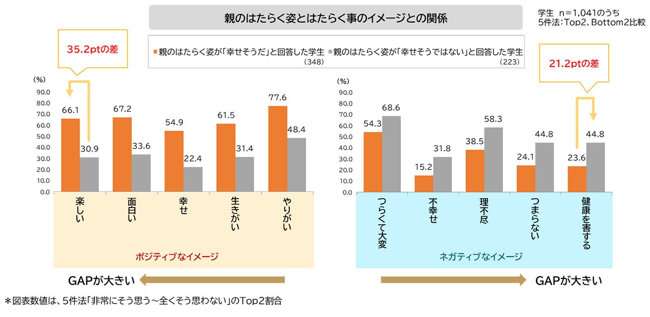 6. 親のはたらく姿と子どものはたらくイメージの関係:親のはたらく姿に対する子ども(学生)の印象と、学生のはたらくイメージ【ポジティブ/ネガティブ項目】との関連を分析した。結果、親が「幸せそうに見える」学生ほど、はたらく事へのポジティブなイメージを持っており、「幸せそうに見えない」学生ほどネガティブなイメージを持っていた。本分析は相関であり因果関係ではないものの、中でも「楽しい」は35.2ポイントの差が生じており、家庭内での親(就業者)の働く姿の印象が、子どもの労働観やキャリア観の形成に影響する可能性が示唆される。