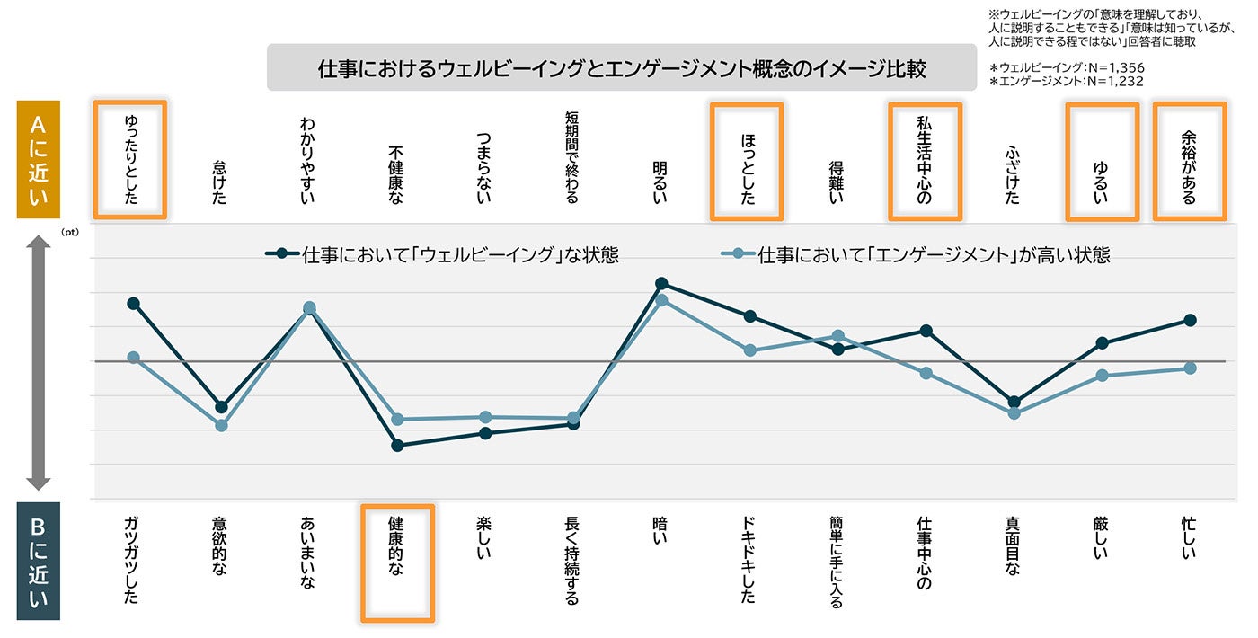 ウェルビーイングとエンゲージメントのイメージ比較:はたらく上での「ウェルビーイング」と近似する概念として「エンゲージメント」と比較した。結果、エンゲージメントもウェルビーイングも仕事に対して「意欲的」で「継続的」で「真面目な」イメージが共通していた。しかし、ウェルビーイングには、「ゆったり」、「健康的」「ほっとした」「私生活中心」「ゆるい」「余裕がある」といった、心身の安定や自然体を想起させるイメージが特徴的であった。これに対し、エンゲージメントは「ガツガツ」「ドキドキ」「仕事中心」「厳しい」「忙しい」といった、仕事への強い集中や緊張感を伴うイメージが強く表れていた。