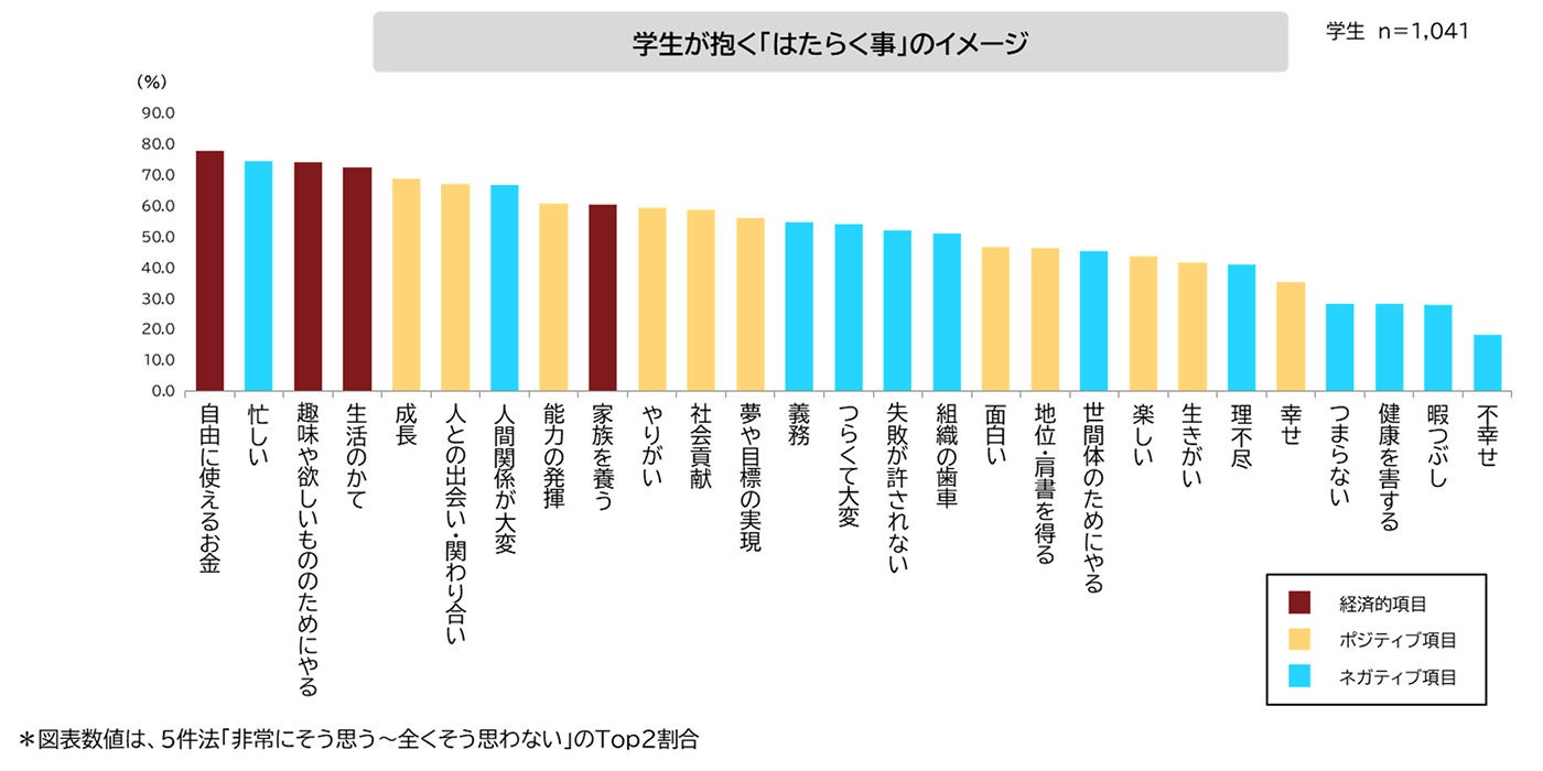 今日の学生が抱く「はたらく事」のイメージでは、「自由になるお金を得る」、「趣味や欲しいものを買う」、「生活のかて」といった経済的側面が中心である一方、「夢や目標実現」「社会貢献」「成長」といった前向きな要素や、「世間体のため」、「忙しい」、「人間関係が大変」といった消極的な要素も半数程度にみられた。また、本調査では、親の働く姿が子どもの労働観に影響を与えることが示唆された。企業が、就業者(親世代)のウェルビーイング向上に取り組むことは、回避的な労働観の連鎖を断ち、子どもの「働くことへの希望」を育む社会的意義を持つ。