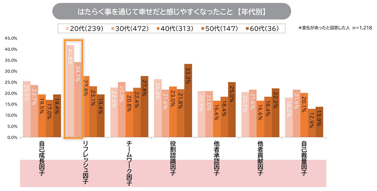 その結果、20代・30代で「リフレッシュ因子」をあげる割合が顕著に多く、次いで「自己成長因子」や「役割認識因子」「チームワーク因子」があがった。60代では、「役割認識因子」「チームワーク因子」「他者承認因子」といった集団への所属と貢献をあげる傾向が確認された。