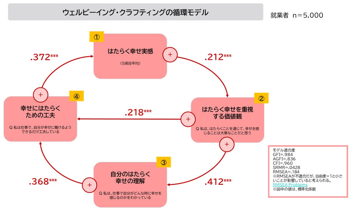 8. 幸せを感じる体験がウェルビーイングの出発点:就業者が仕事の中で「幸せを感じる体験」を得ることが、ウェルビーイングの好循環を生む起点となることが確認された。「はたらく幸せ実感」が価値観を育み、自己理解や行動を促し、再び幸せを高める流れにつながっている。