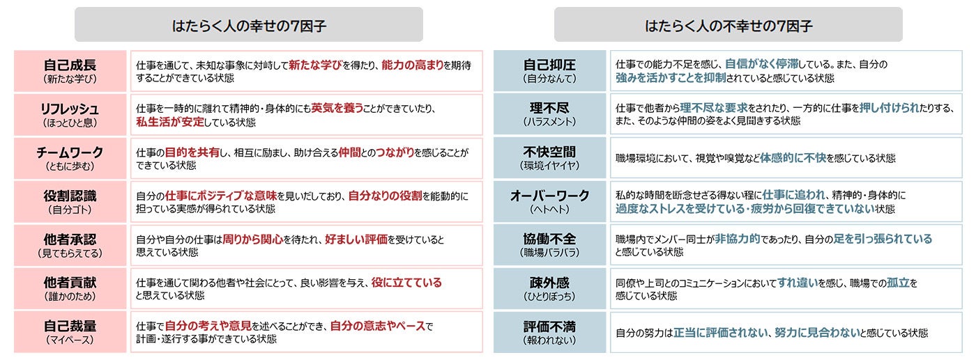 ■ 本調査における、はたらく事を通じて感じる幸福感や不幸感の要因は、それぞれ7つの因子で構成され以下のように定義。7つの因子の状態を良好に保つことによって、職業生活ウェルビーイングを高めることができる。